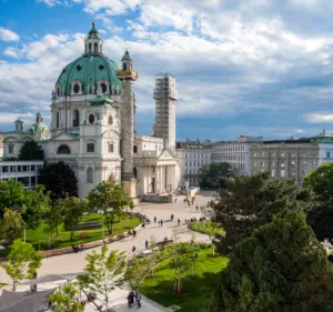 Vom neugestalteten Wien Museum aus gibt es einen eindrucksvollen Ausblick auf den Karlsplatz. Er ist ein gelungenes Beispiel für die klimafitte Umgestaltung eines öffentlichen Raums. © Stadt Wien / Gerd Götzenbrucker